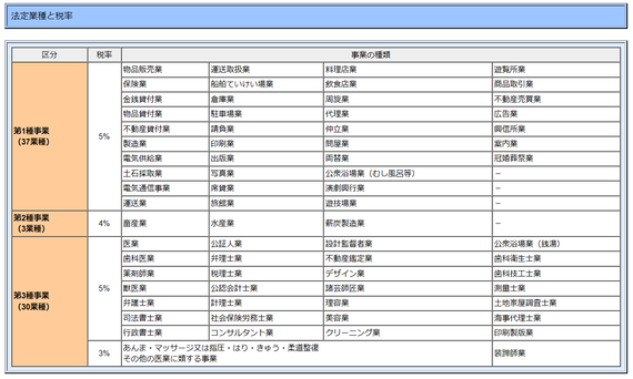 | 税率 | 法定列挙されている事業を第1種事業、第2種事業、第3種事業に分類し、それぞれの業種に応じて税率が定められています。 |