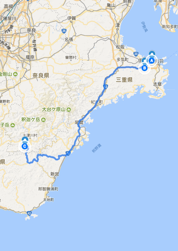伊勢神宮を午後1時に出発したところ、道中に2度雨と遭遇しました。原チャリで行っている我々としては一番の試練です。しかも僕は半キャップのヘルメットだったので、雨が降ると前が見えなくなるので最悪です泣